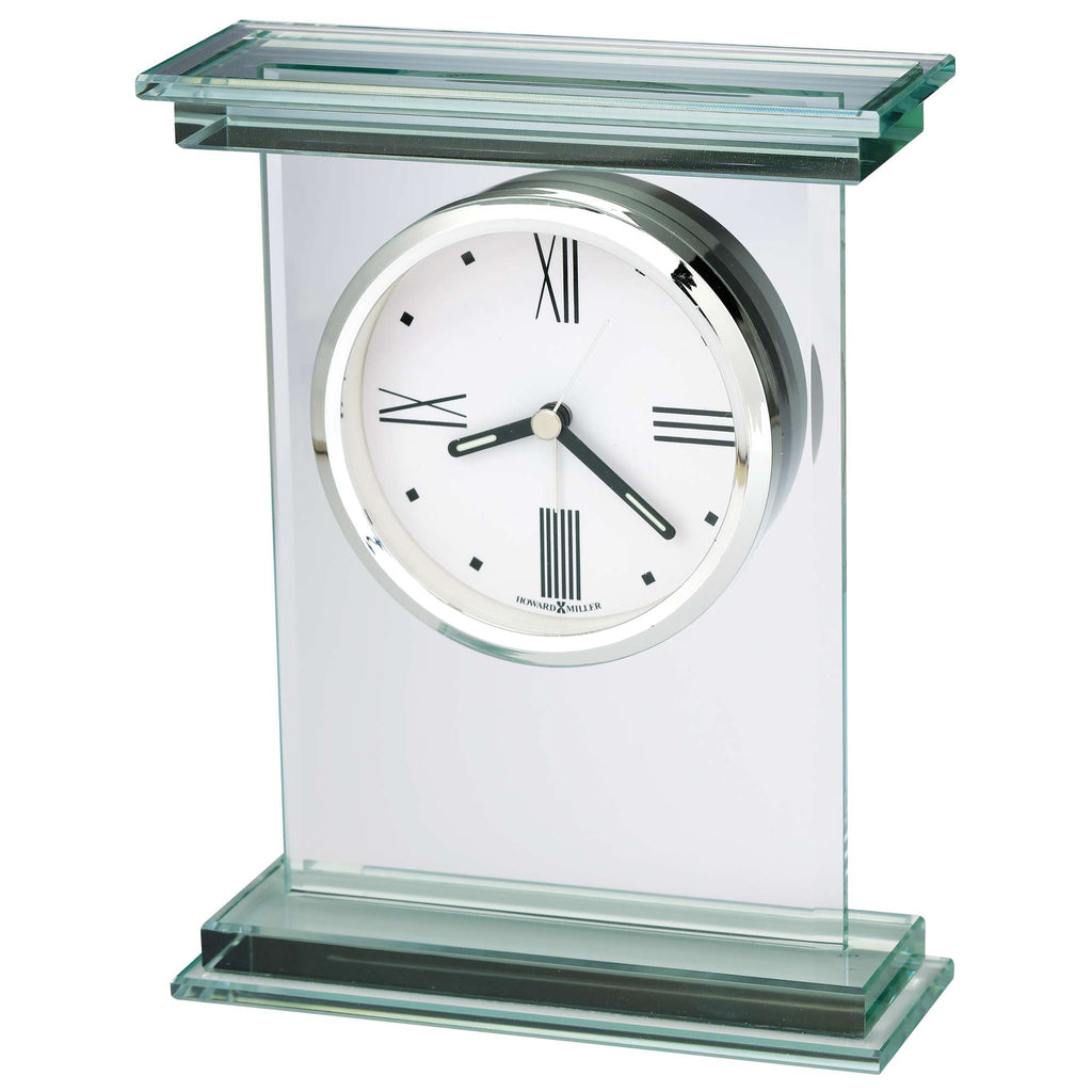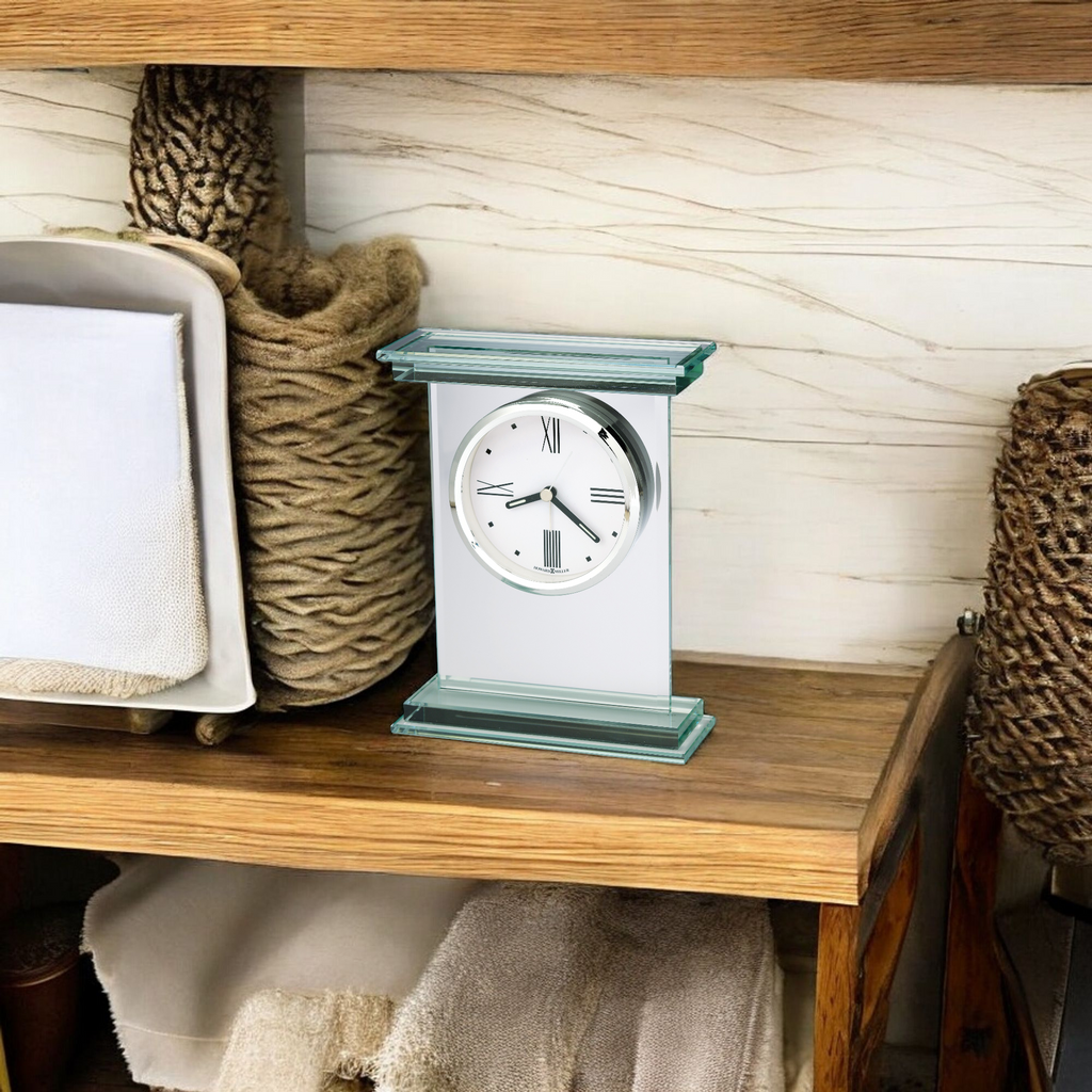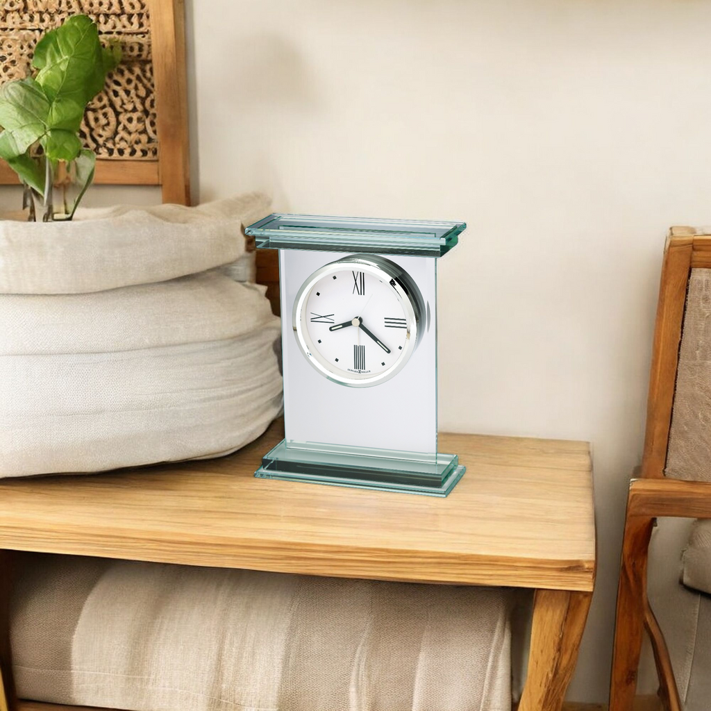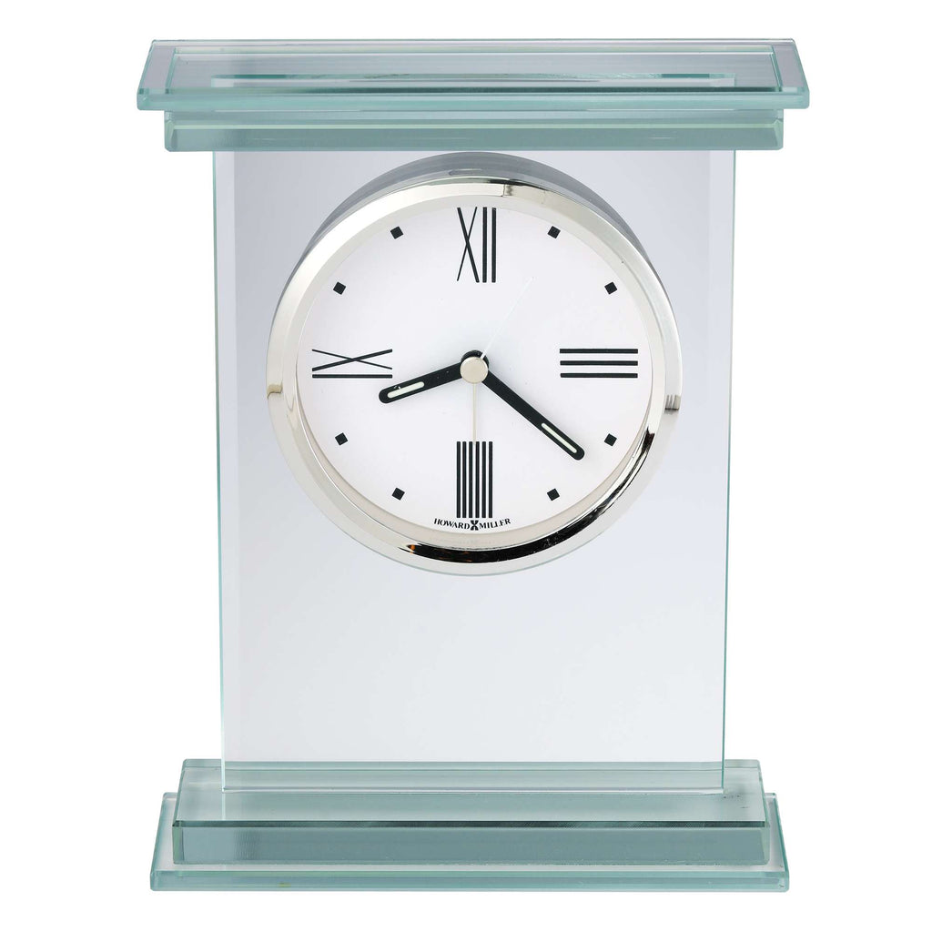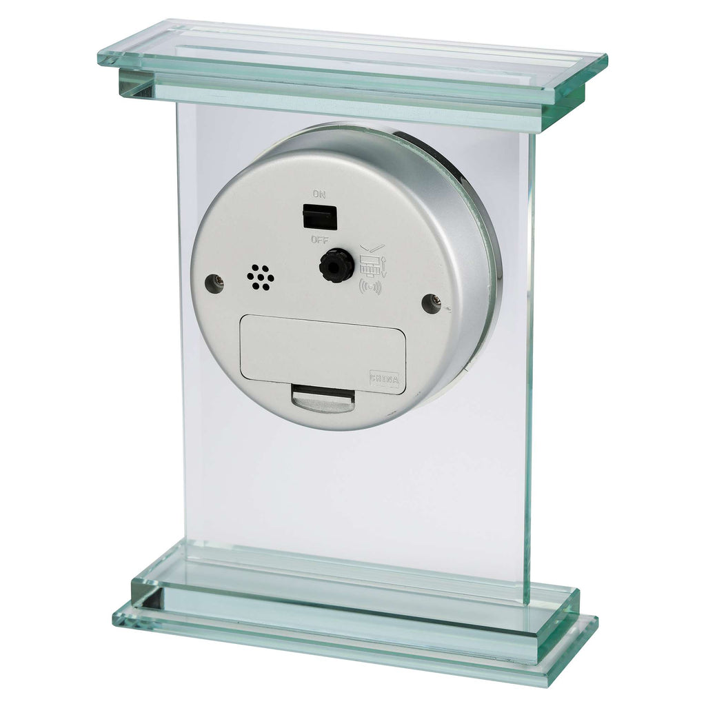 - Modern bracket-style glass alarm clock features a bold, stepped base and top and a polished silver-tone bezel surrounding the dial.