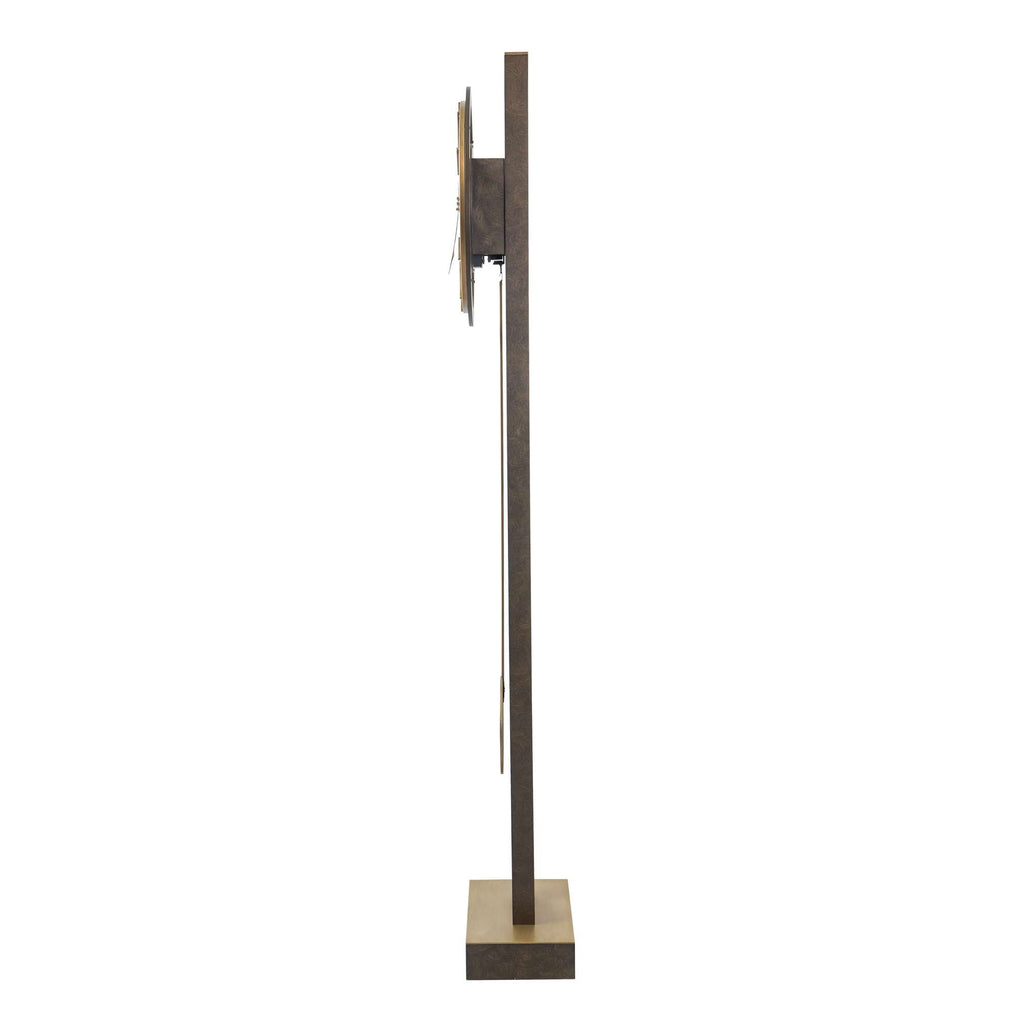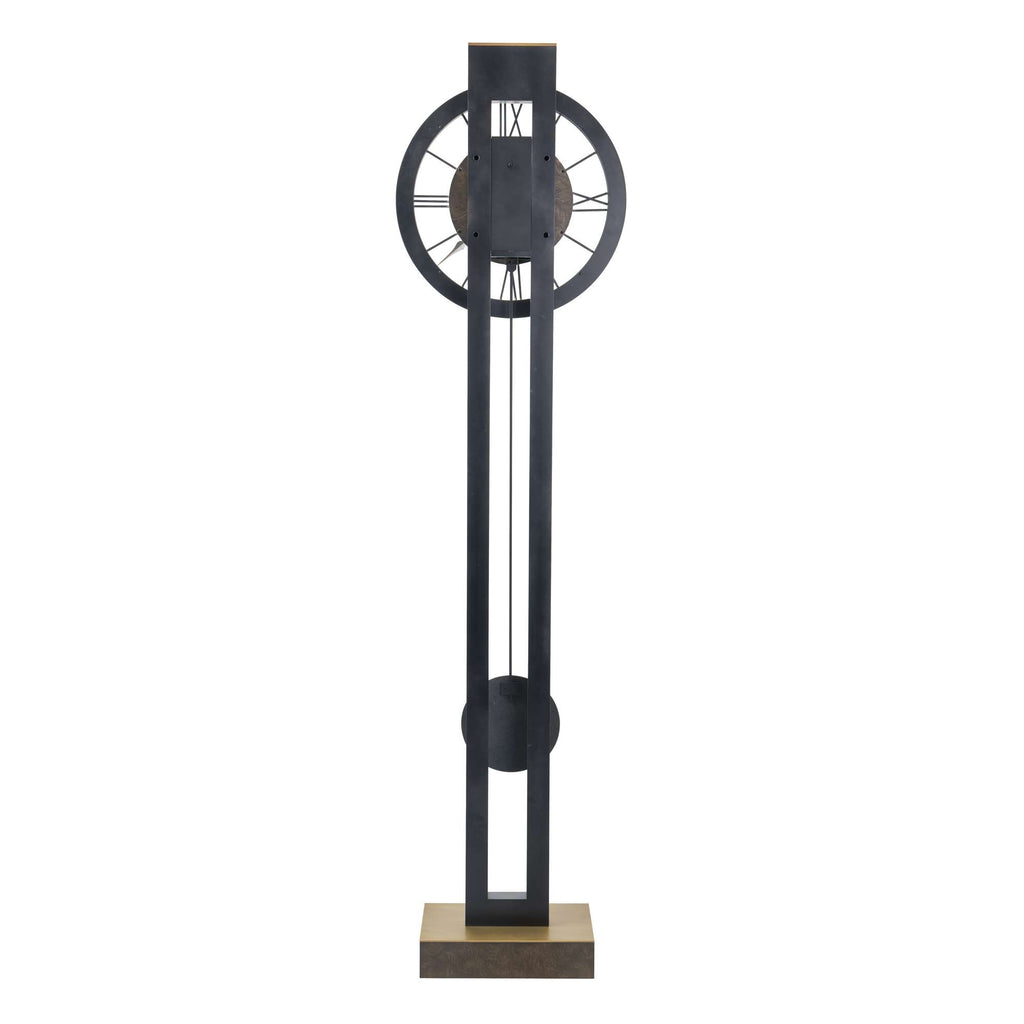 The clock features a charcoal black finish with aged brass wire brushing on select hardwoods and veneers.