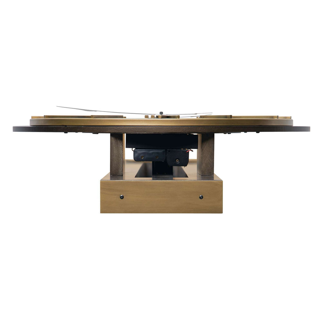 The wooden dial frame is finished in charcoal black with aged brass wire brushing and features inner Roman numerals, bar markers, and motorized gears finished in aged gold.