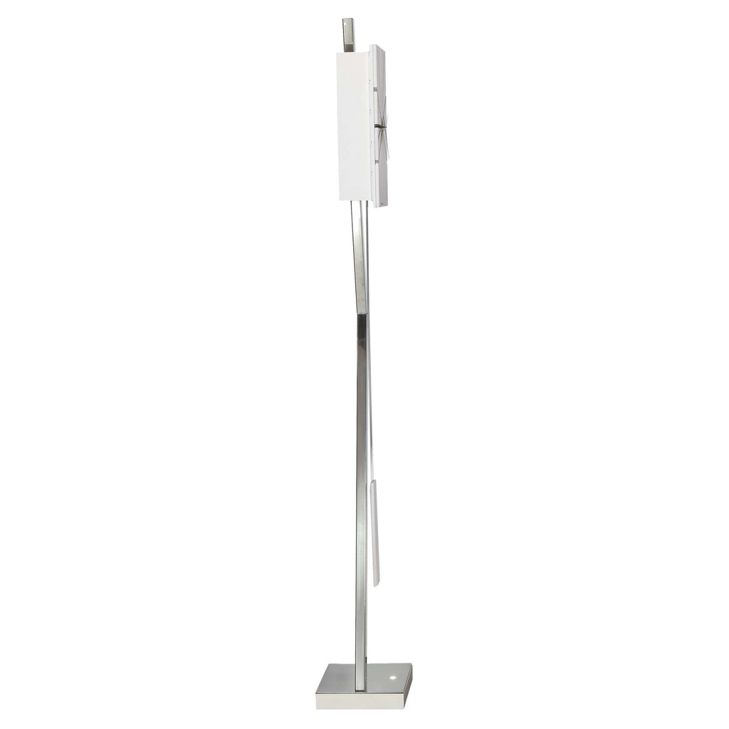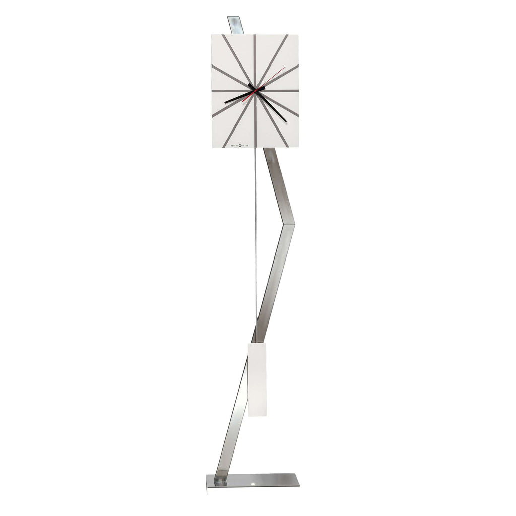 - This grandfather clock features a unique modern design with a rectangular dial finished in Gloss White and chrome-finished hour markers in the background in a sunbeam pattern.