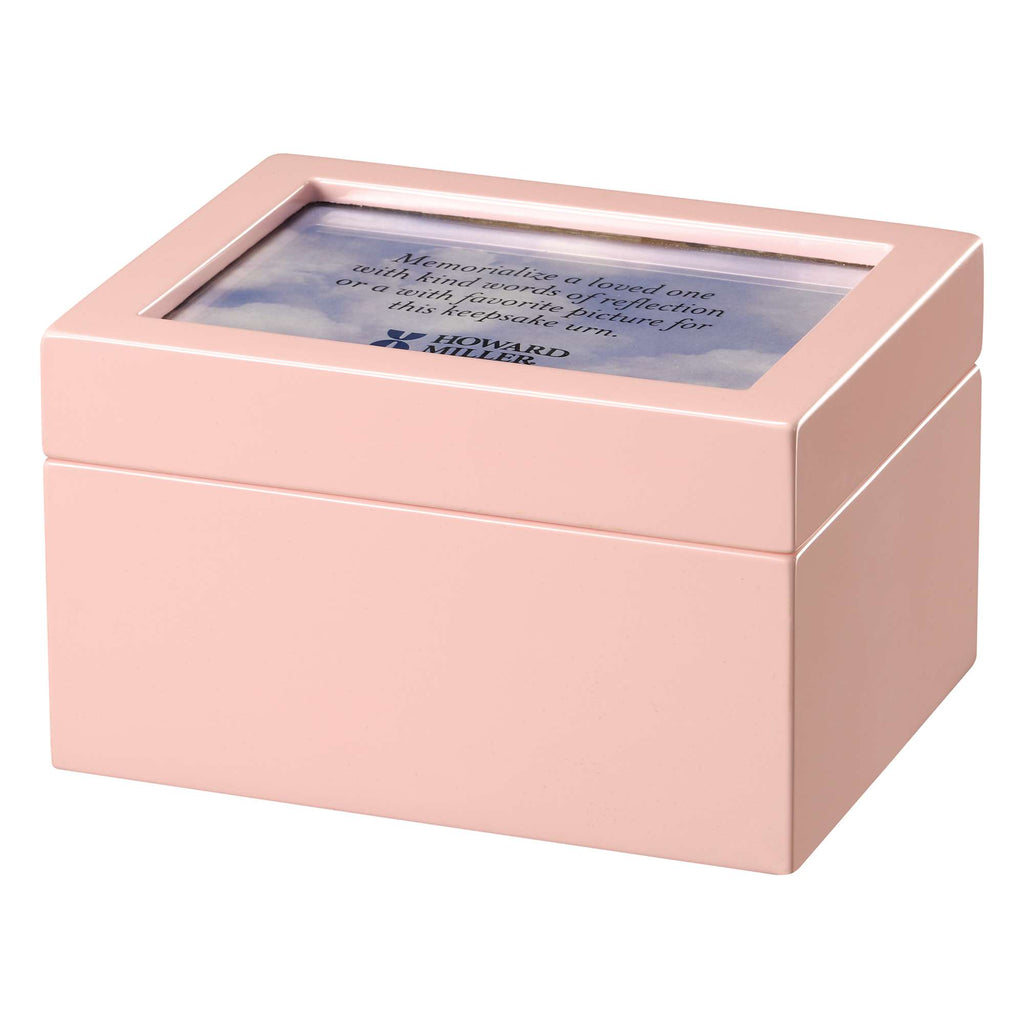 • This memorial urn chest features a high-gloss pink finish and a photo frame opening on the lid which accommodates a 3.75" x 5.25" photo.