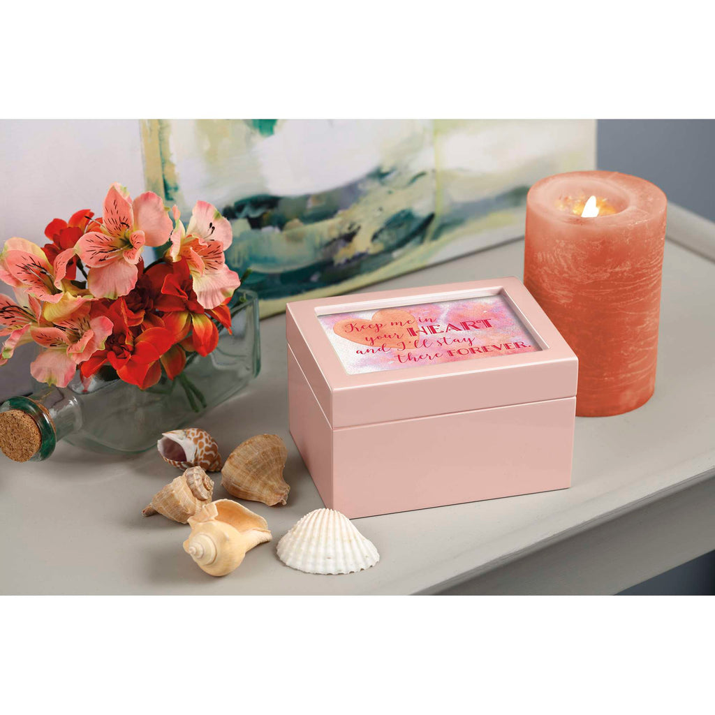 Pink keepsake box with a clear lid displaying an inspirational quote.