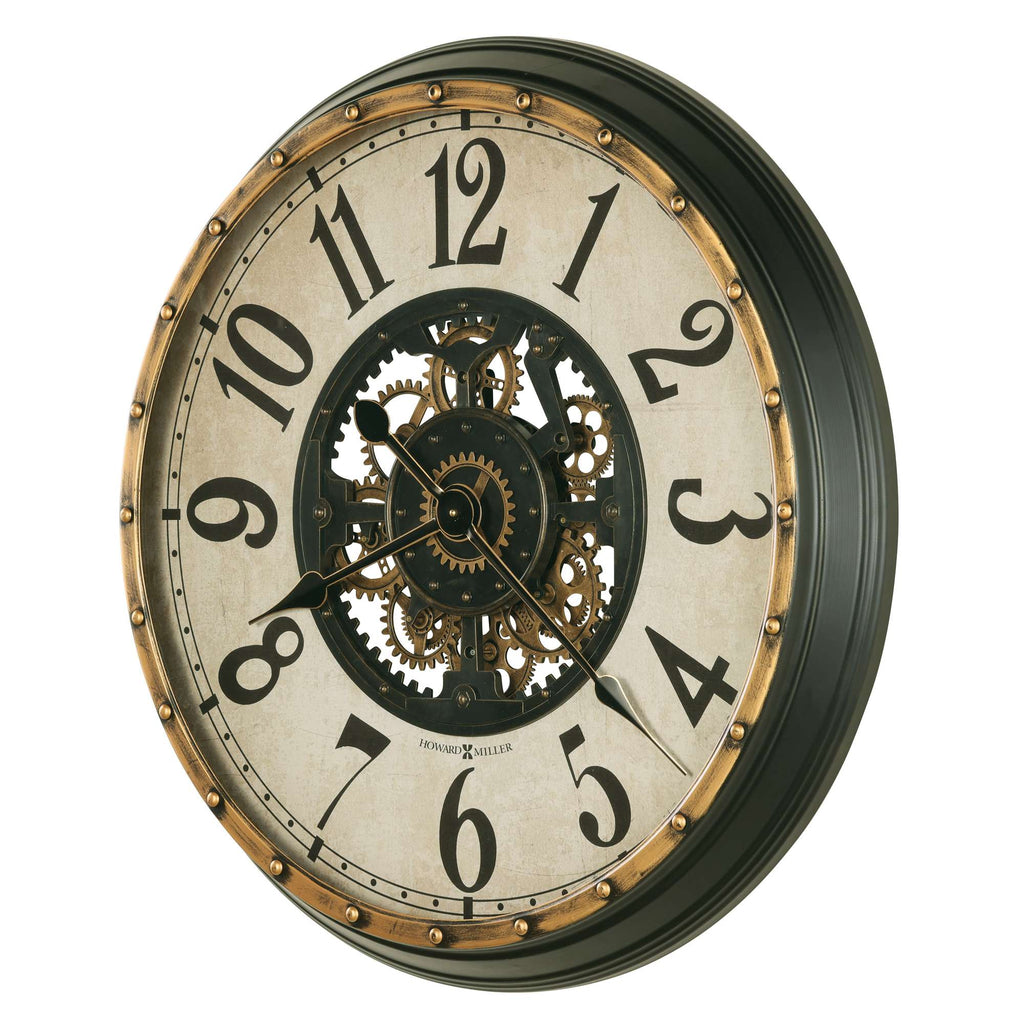 The Malachi Wall Clock operates on quartz movement and requires one AA battery and four D batteries, which are not included.