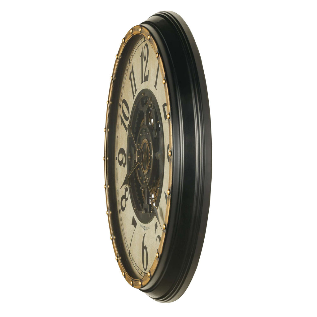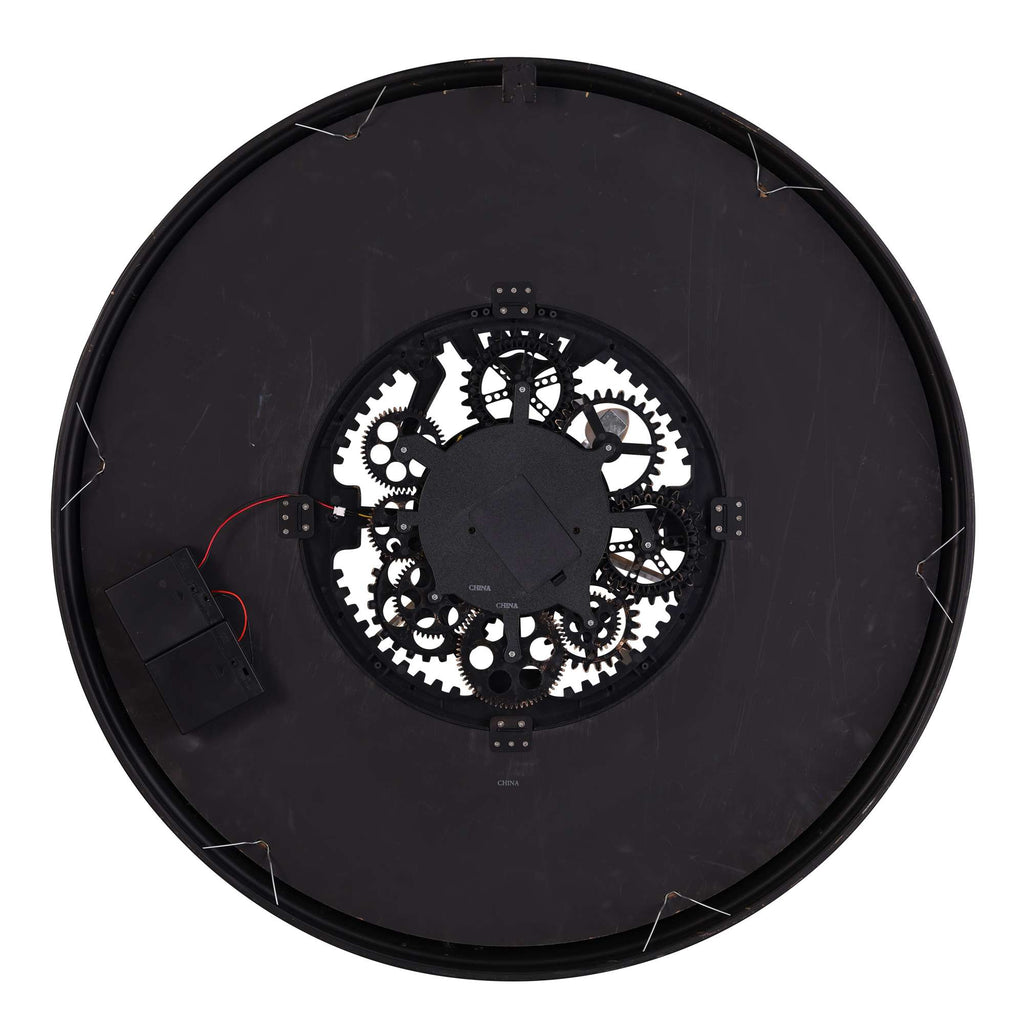 - Aged, off-white dial with black Arabic numerals and open center with antique brass finished gears.