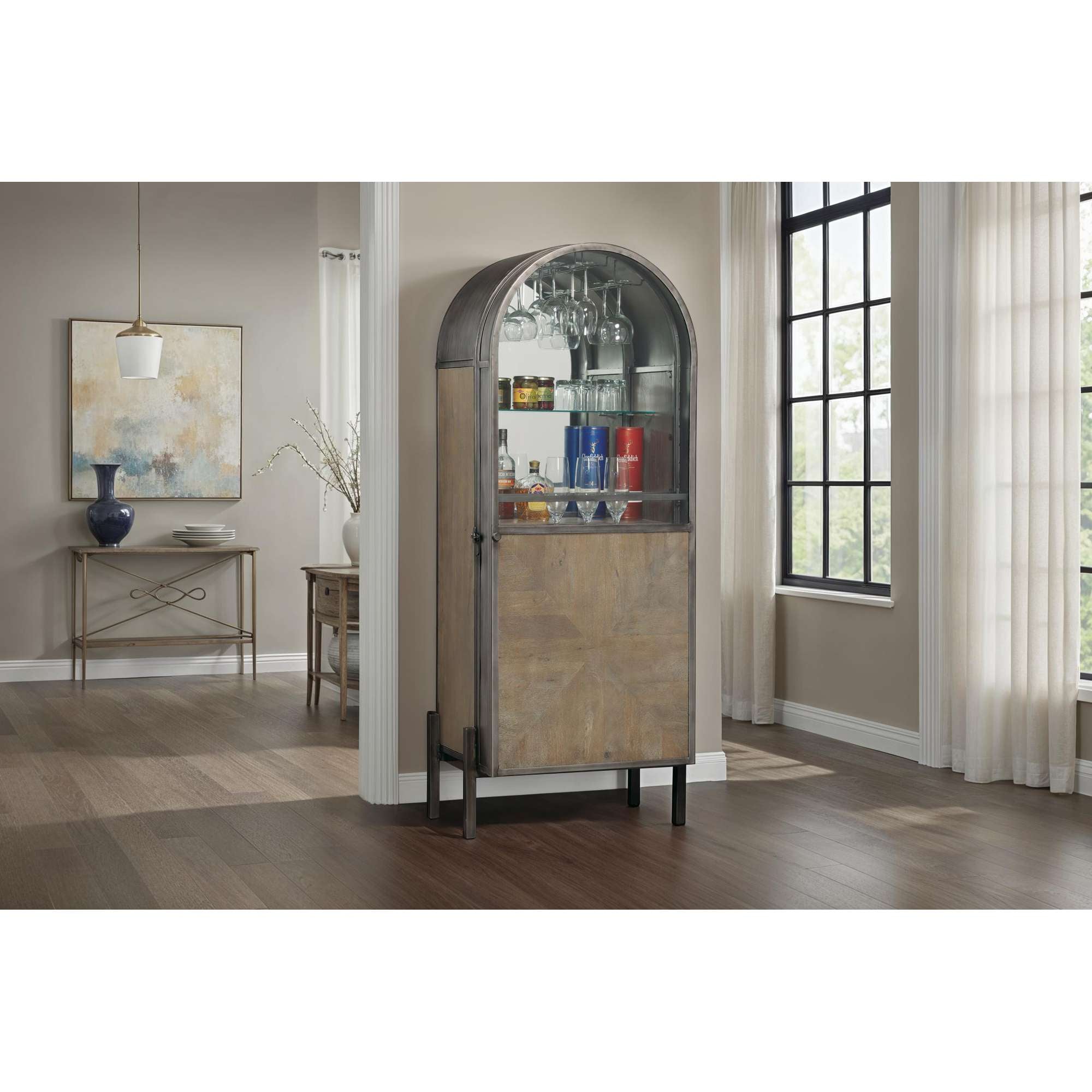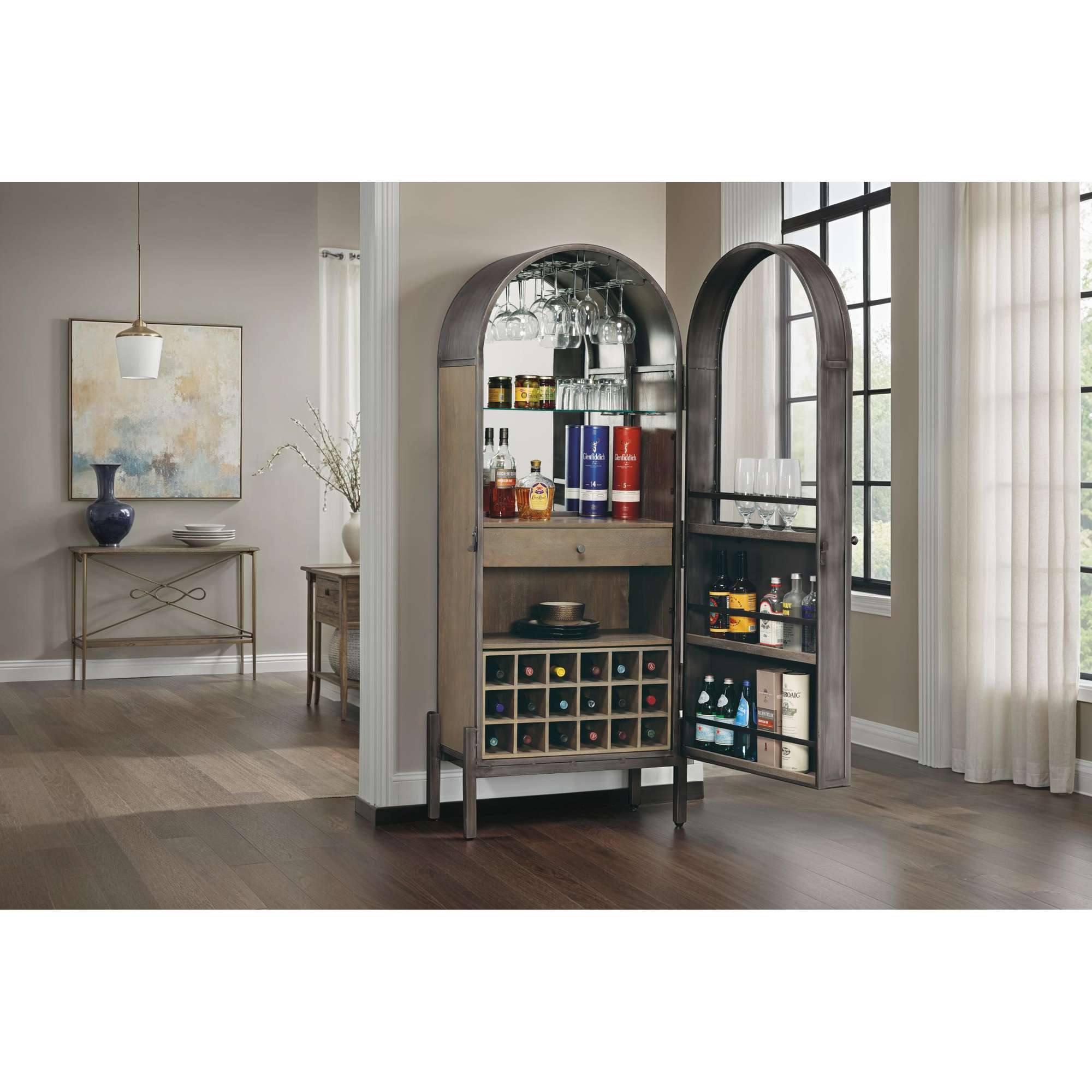 • The top area of the cabinet features a metal stemware rack that can accommodate up to 12 large wine glasses, a mirrored back, a glass shelf for glass and tumbler storage, and a wooden working surface for pouring and mixing beverages.