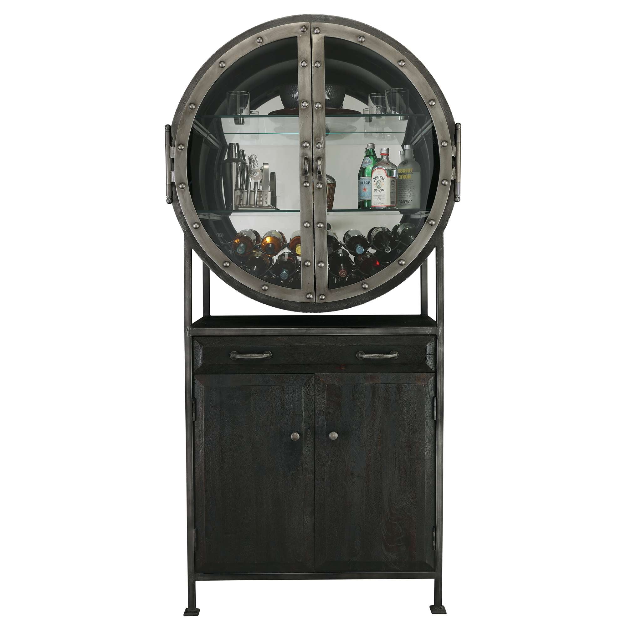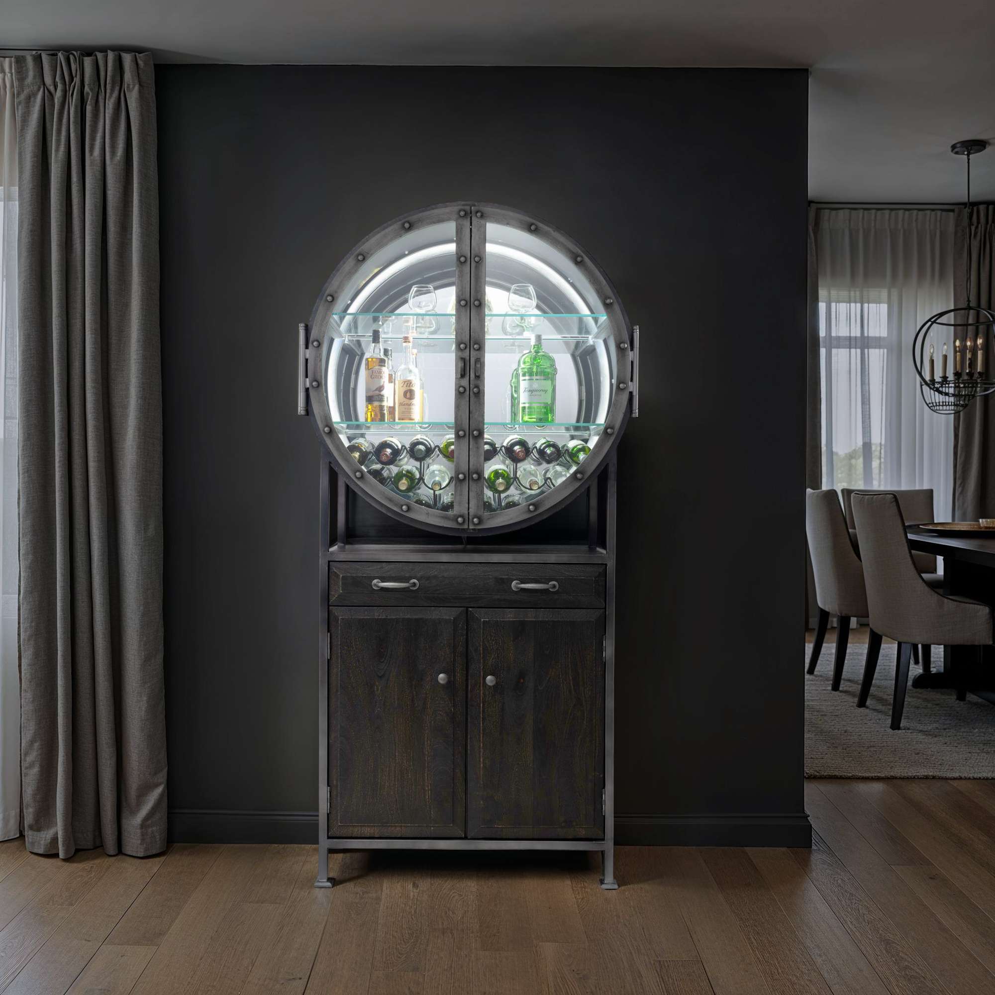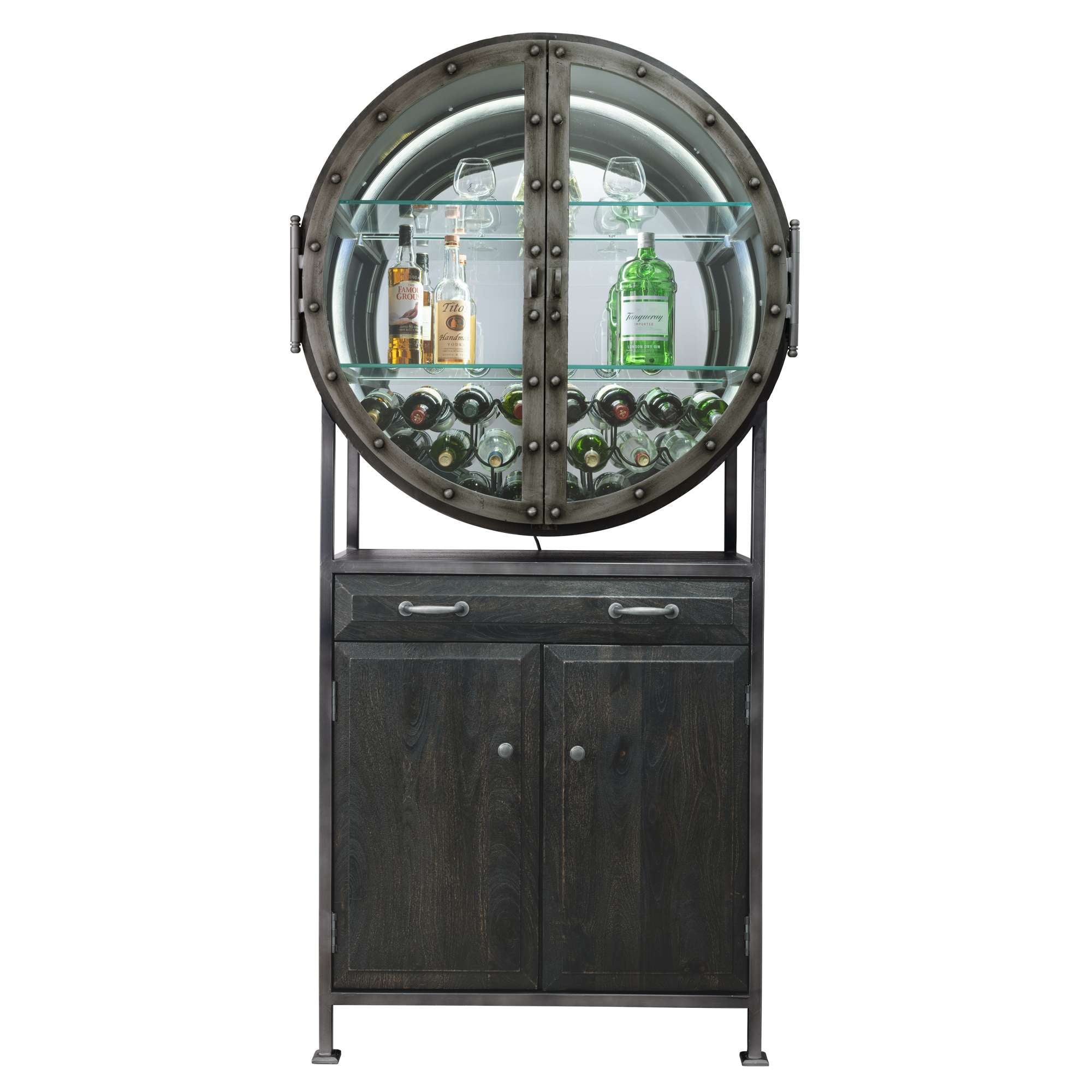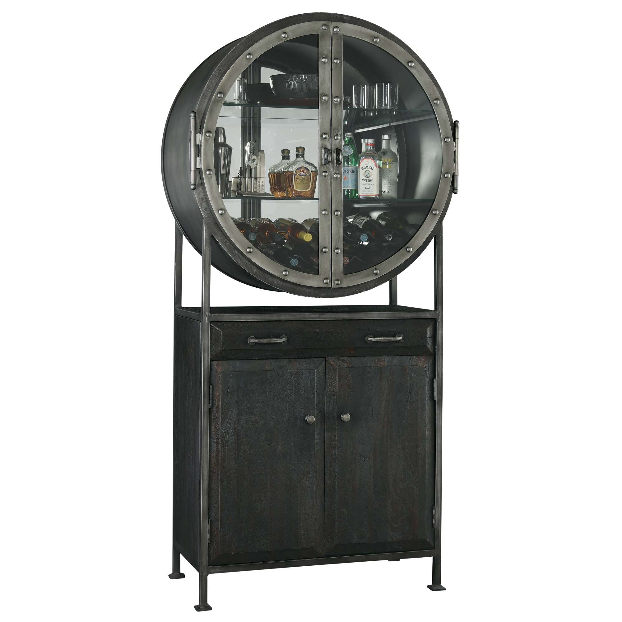 • This porthole bar cabinet features two distinctive, hinged doors with faux rivets, elongated hinges, strap pulls finished in aged silver, and open up to 180°.