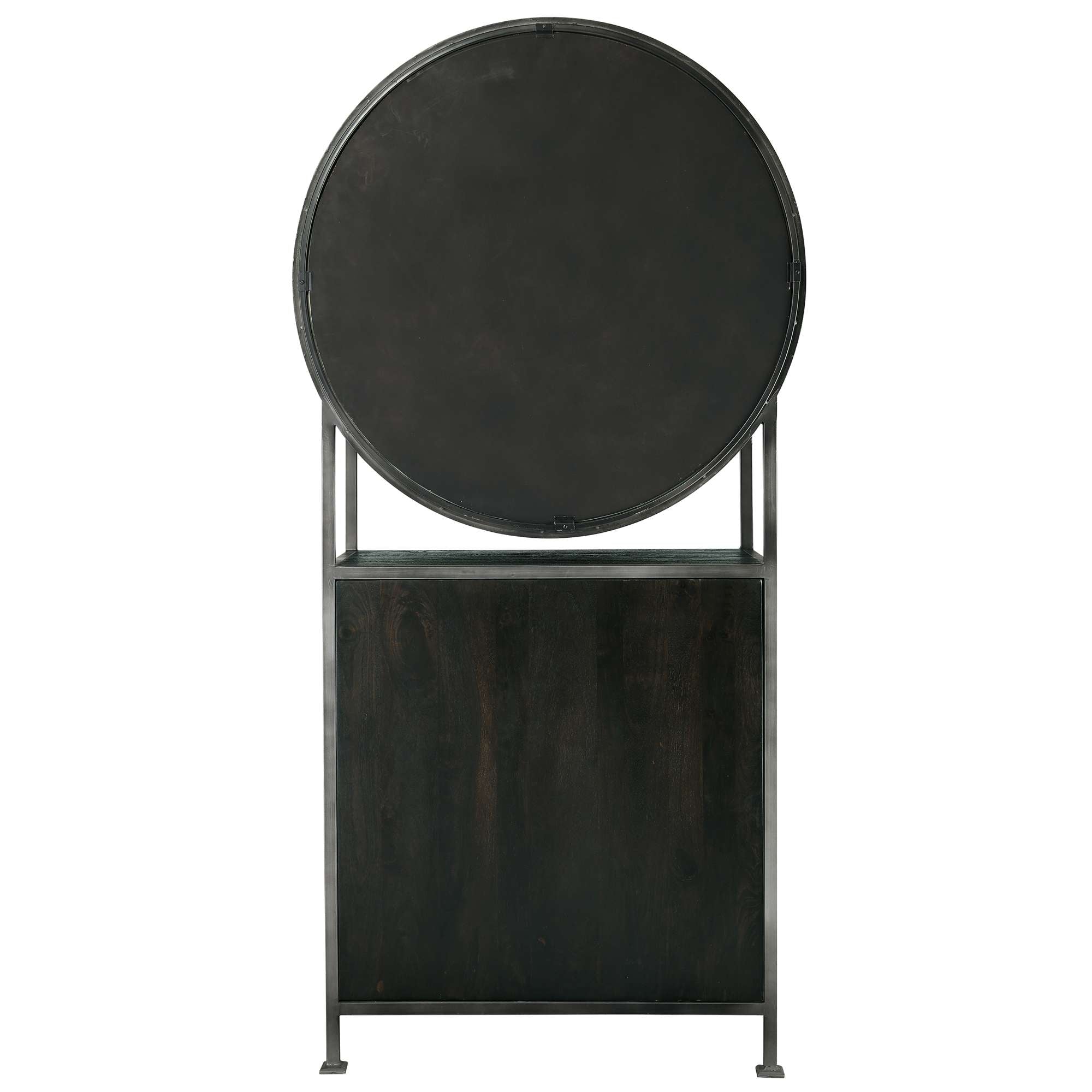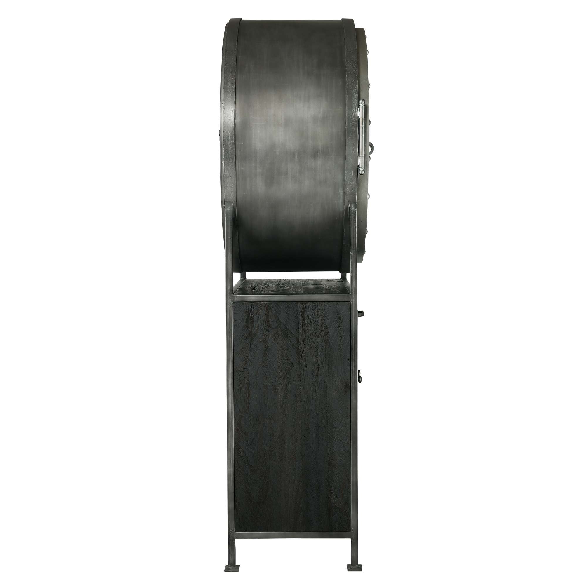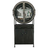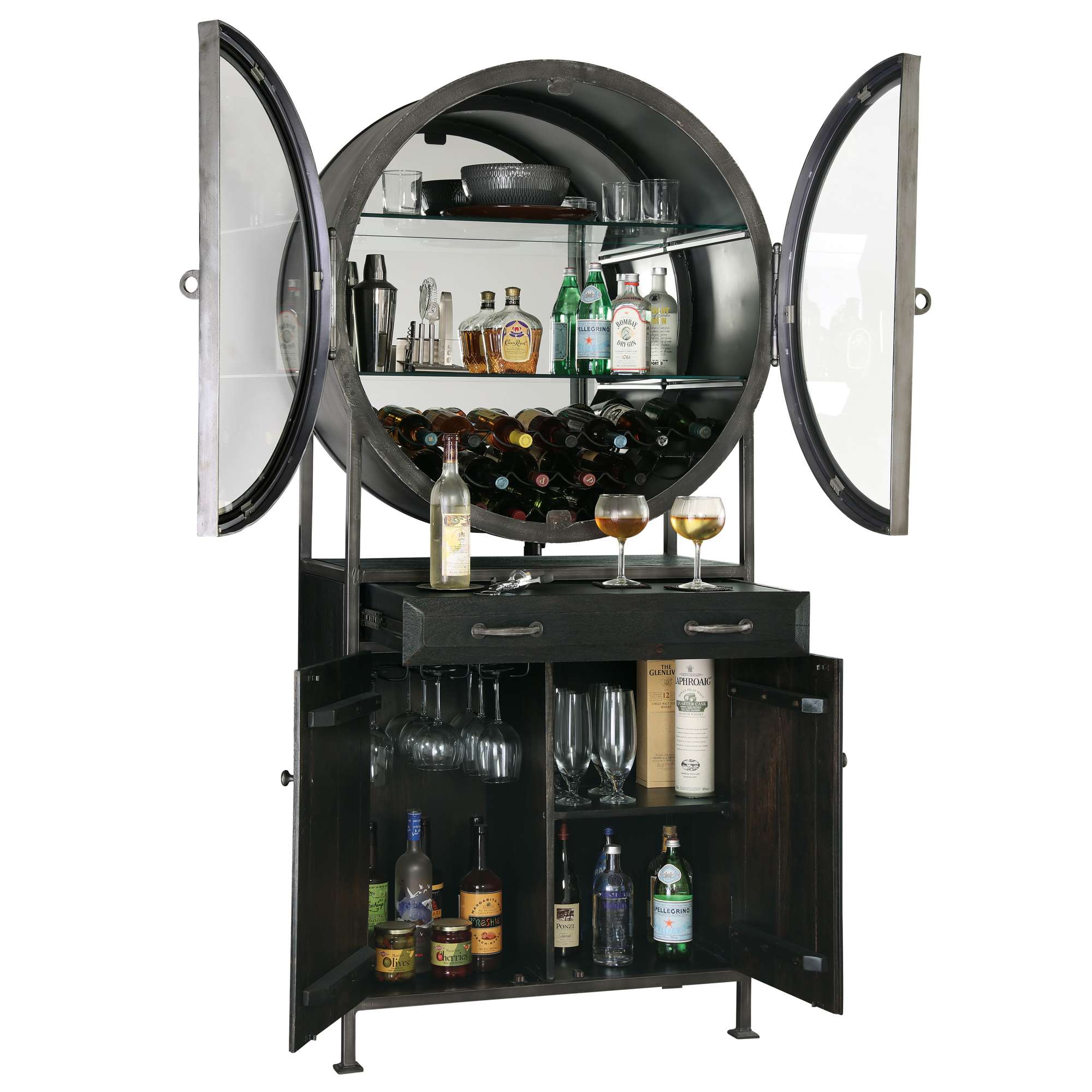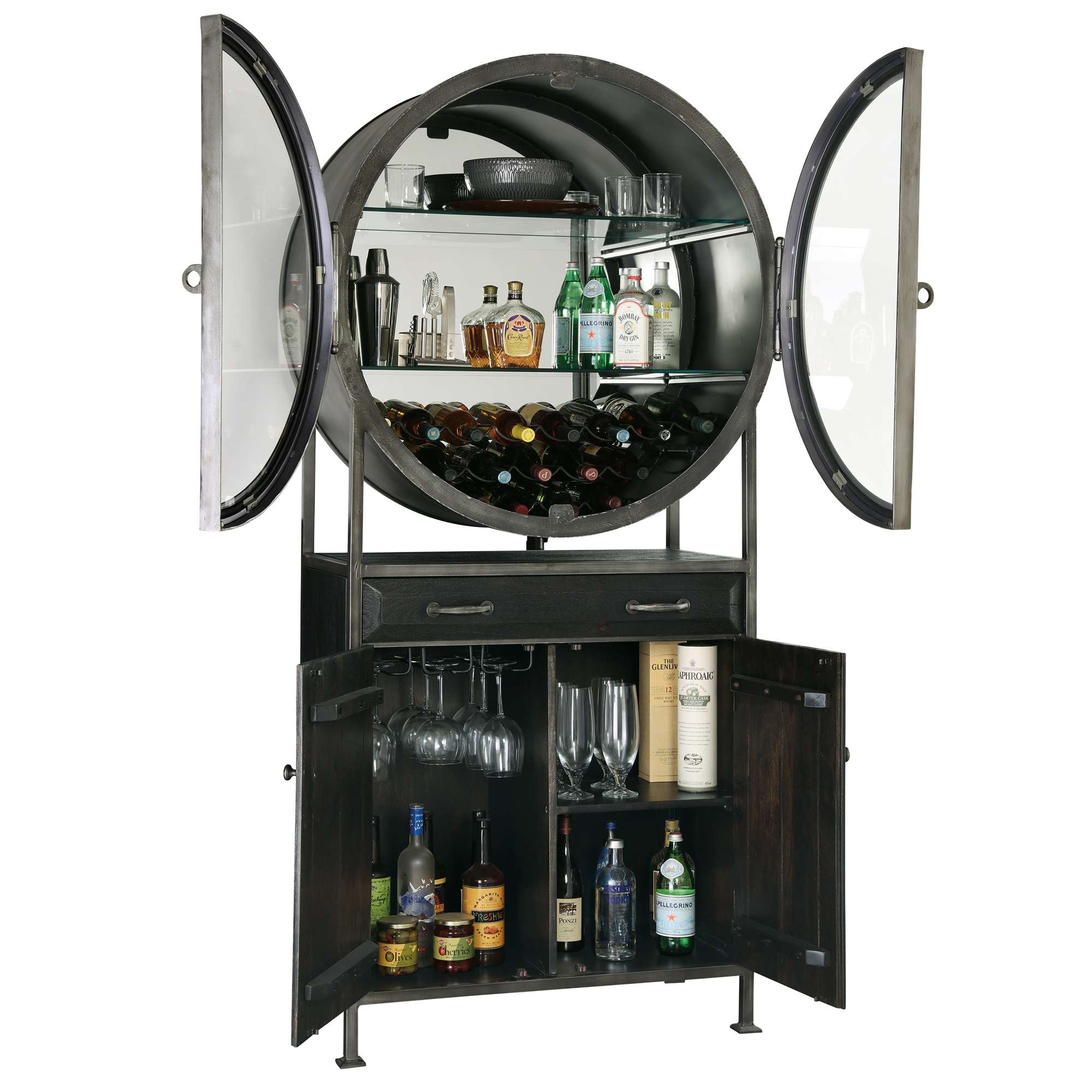 • This porthole bar cabinet features two distinctive, hinged doors with faux rivets, elongated hinges, strap pulls finished in aged silver, and open up to 180°.