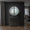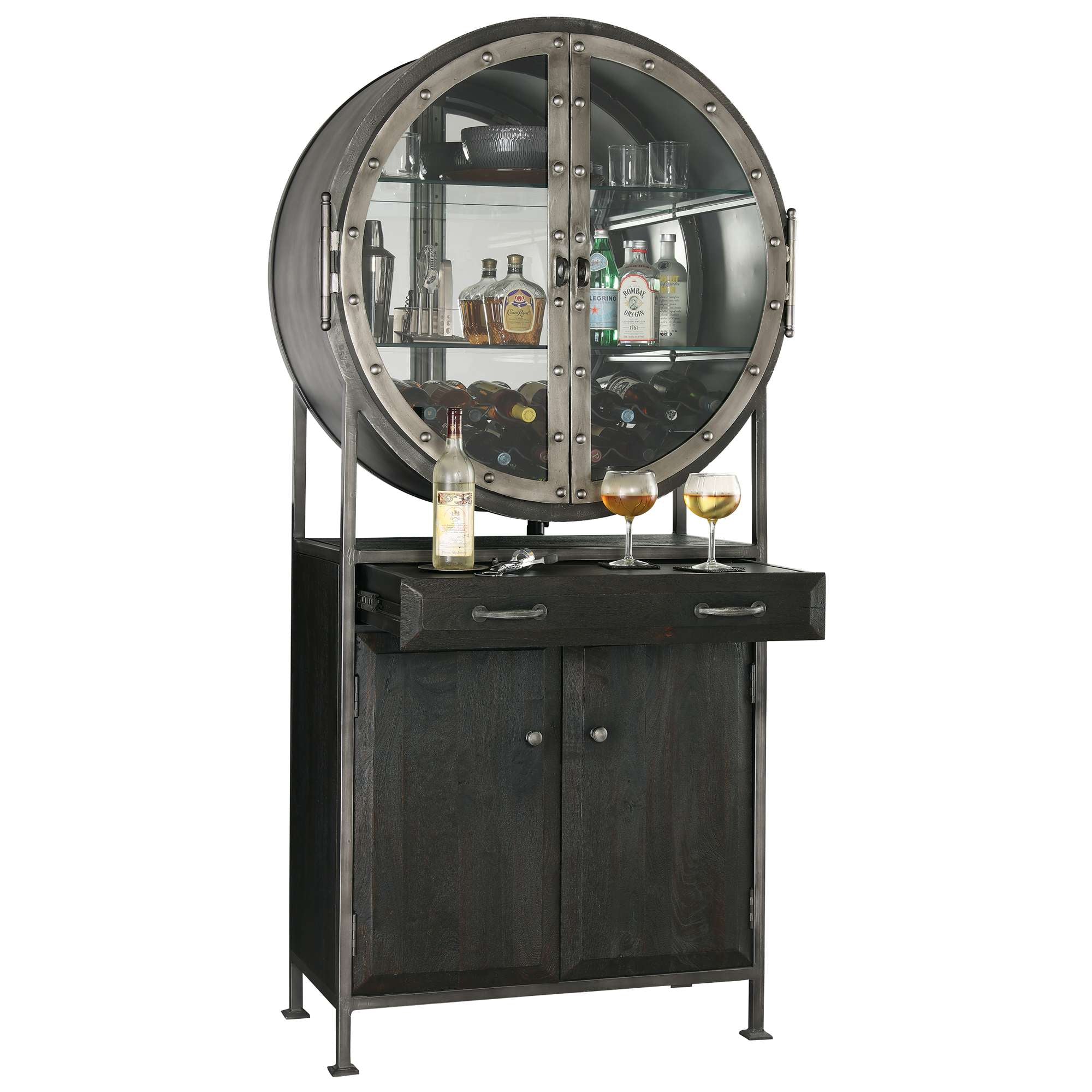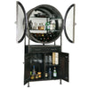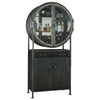 A vintage-style bar cabinet with a circular glass display for bottles and a wooden base.