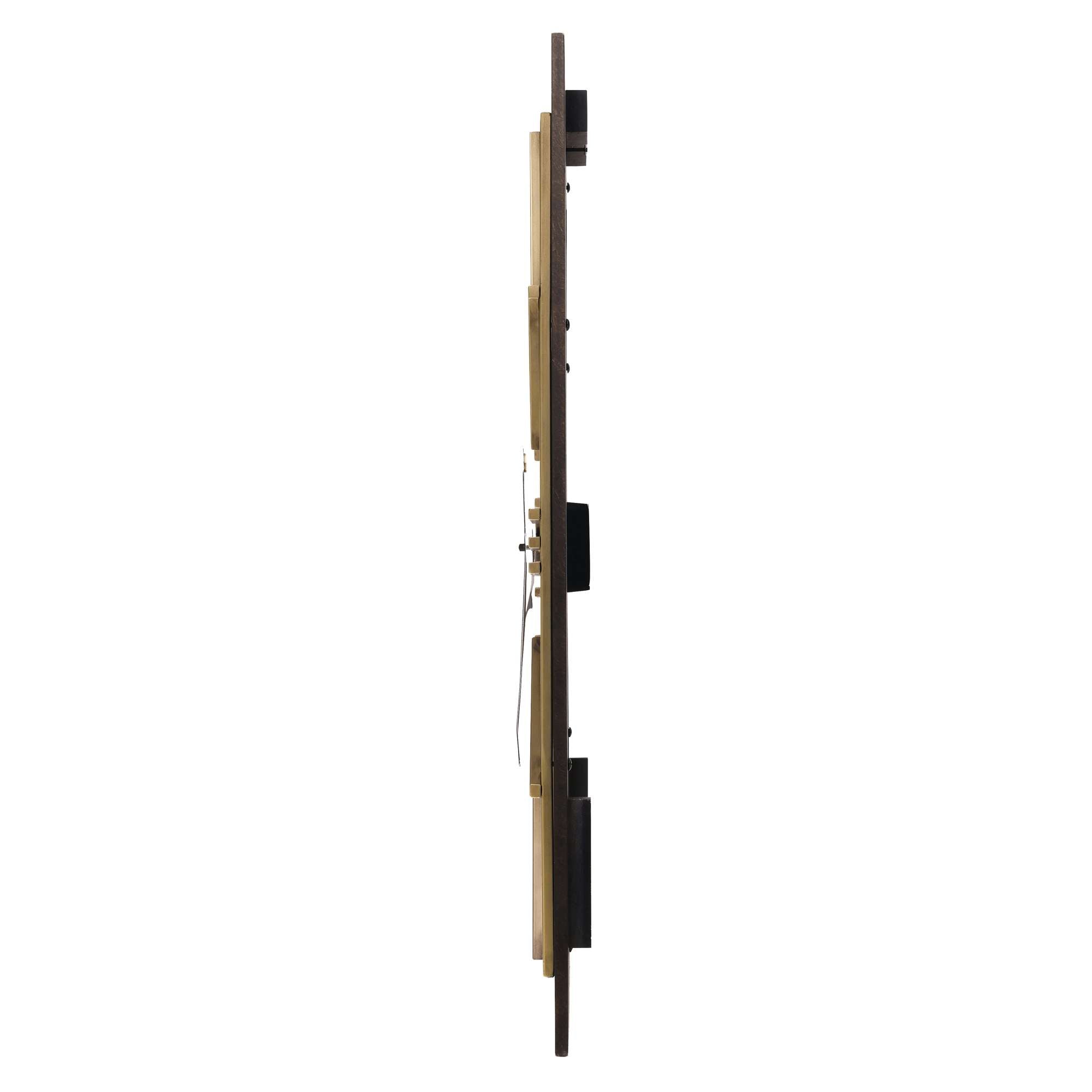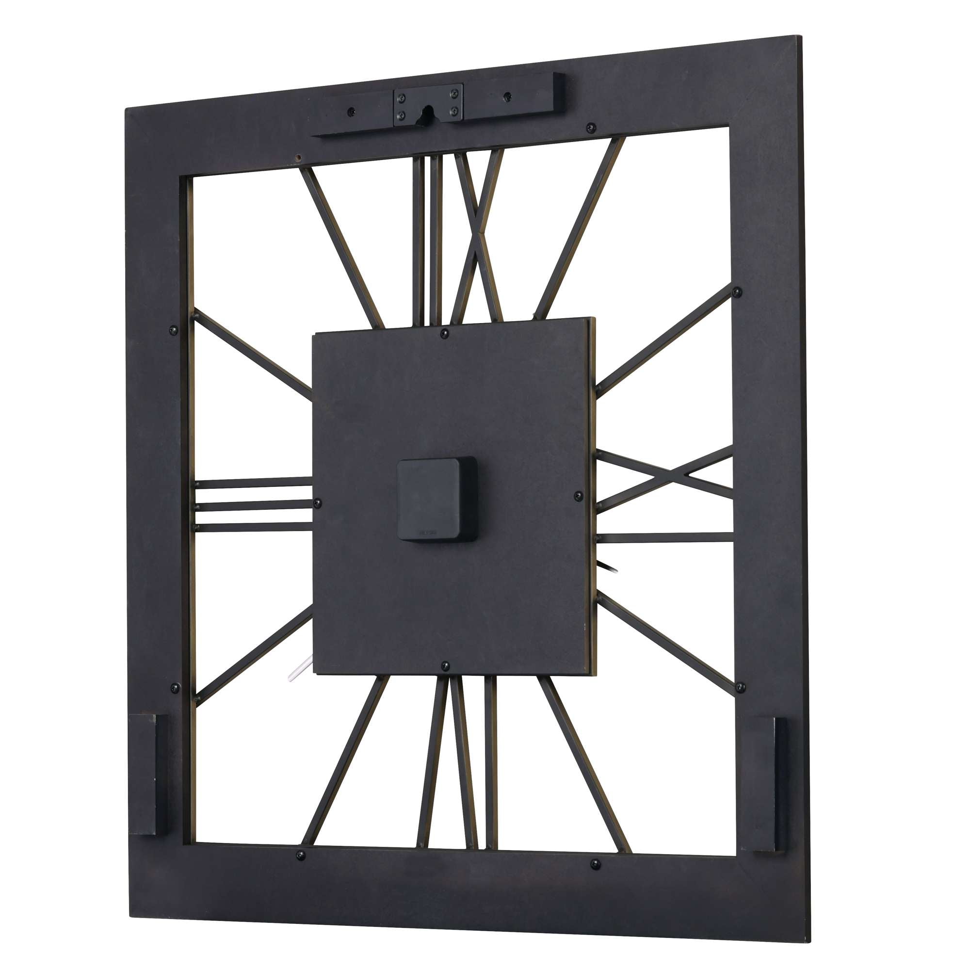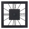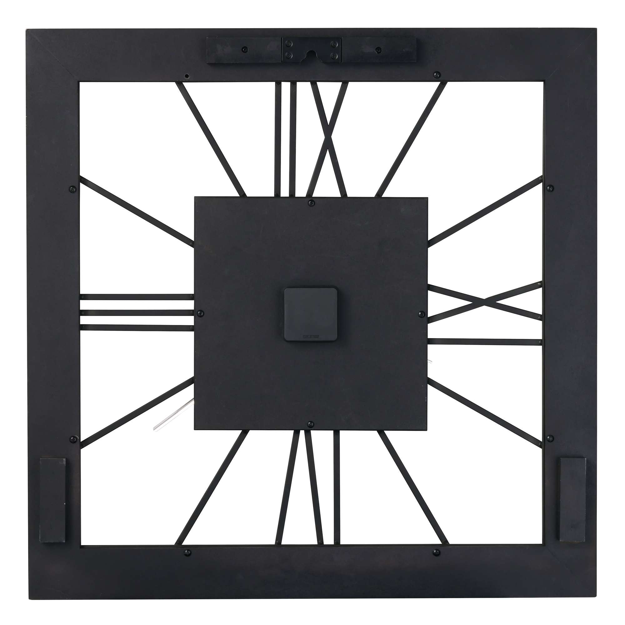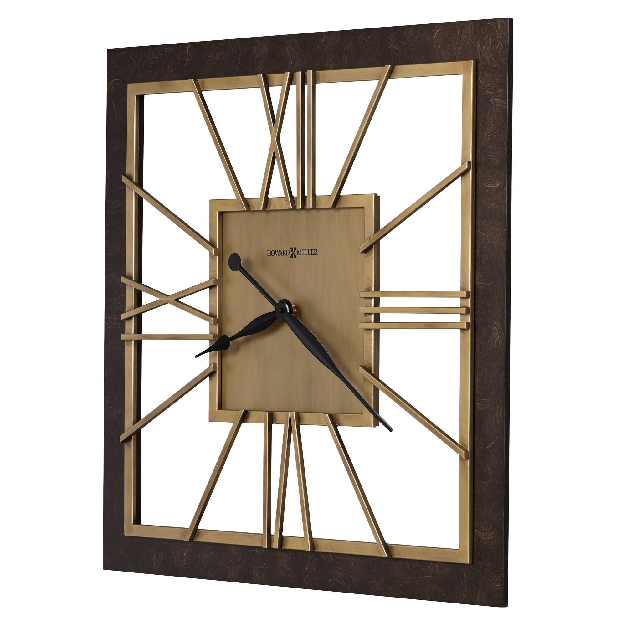 - Wood and metal square wall clock with worn black and antique brass finishes.