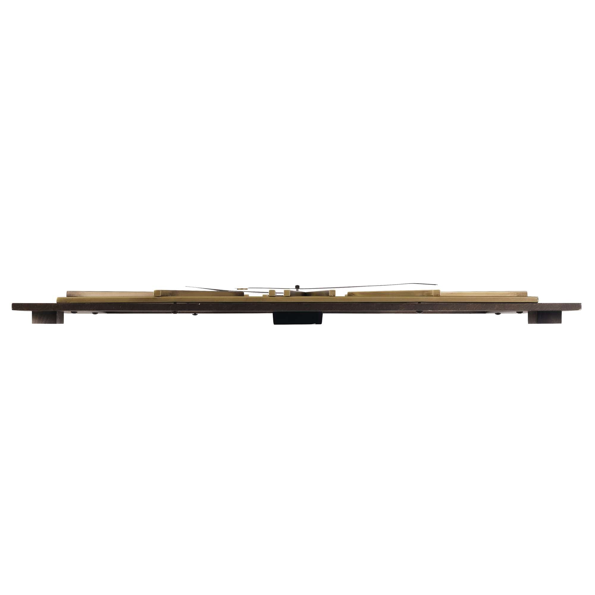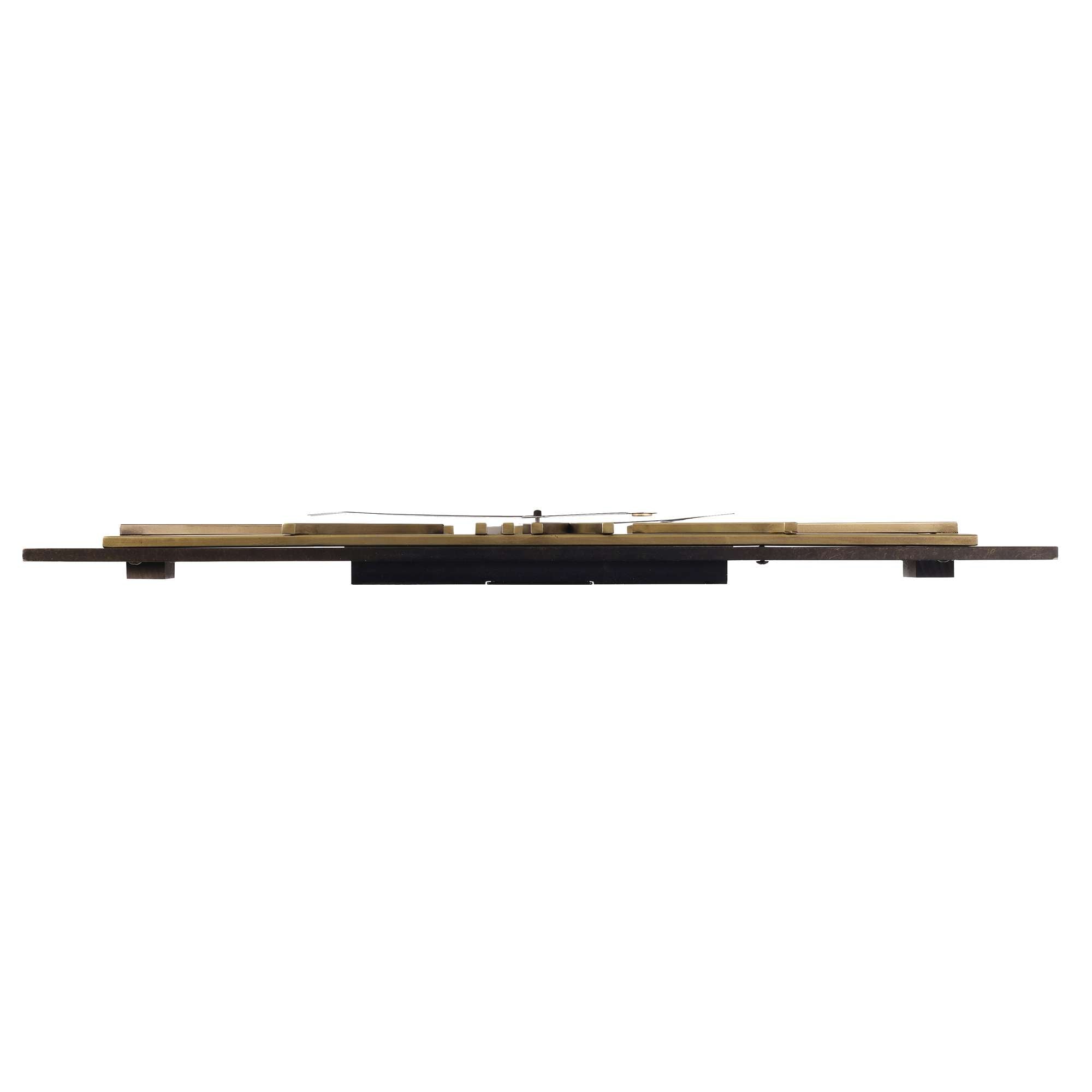 - The inner metal frame includes applied antique brass finished Roman numerals, bar-style hour markers, and a center panel.