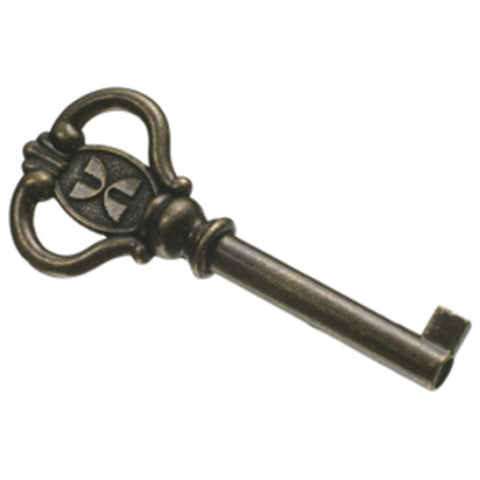 - Antique Brass finished door key with Howard Miller logo, fits most standard floor clock and curio door locks.