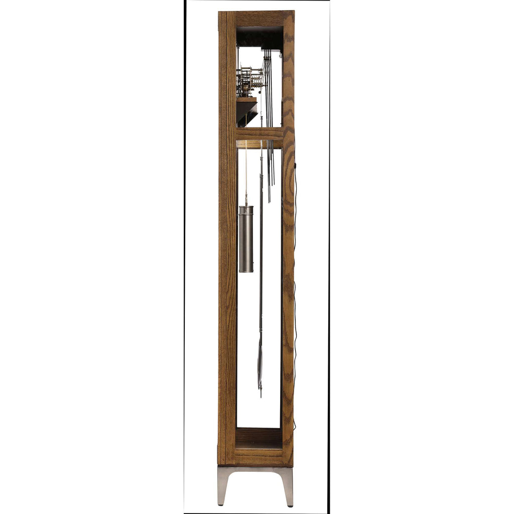 The clock is crafted with select hardwoods and veneers, featuring machined steel, wrought iron metals, and a natural oak wood insert.