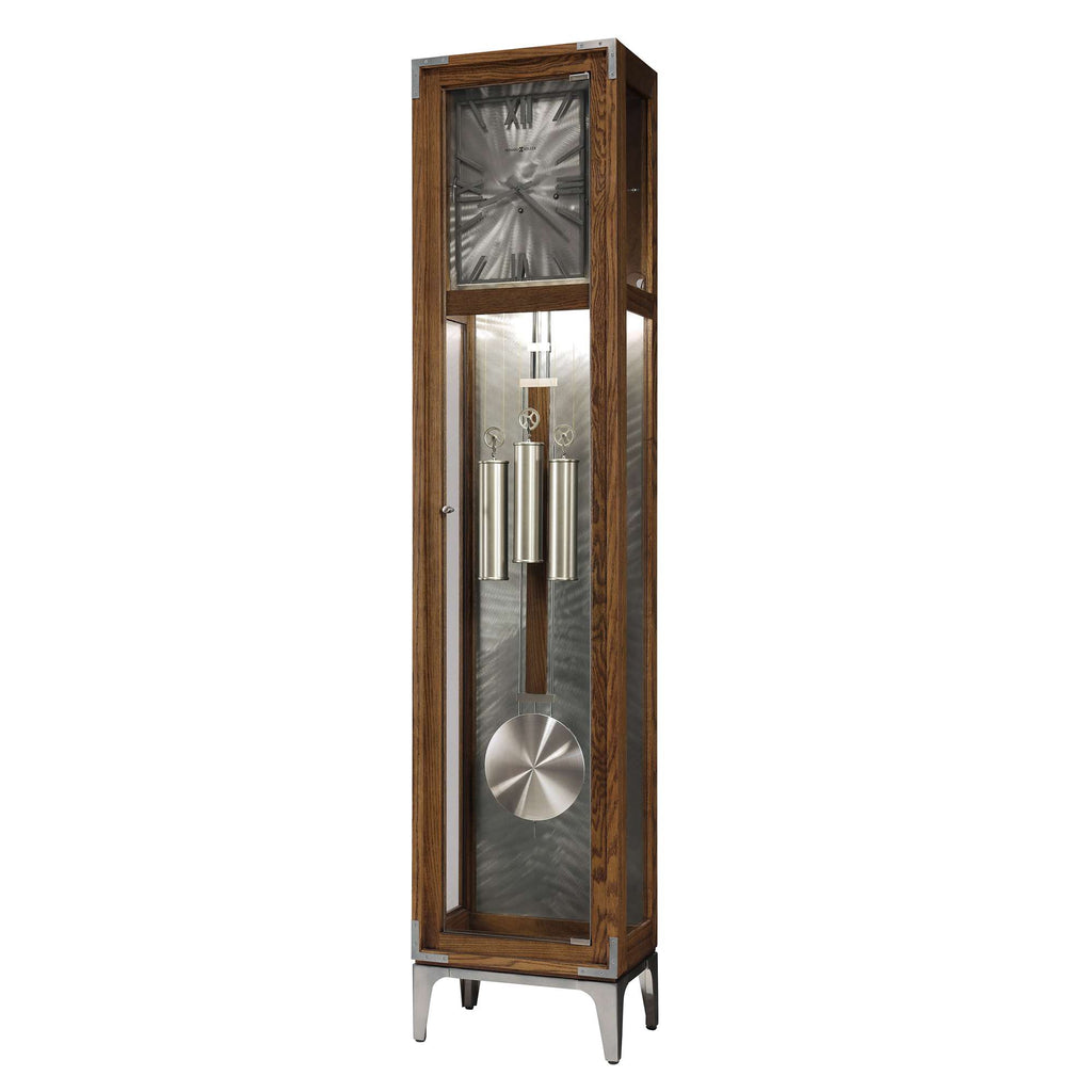 Crafted with selecthardwoods and veneers, this wooden grandfather clock features machined steel,beautifully grained woods, and wrought iron metals, along with brushed nickelcorner brackets, a metal base with brushed nickel legs, and a machined steel background.The dial includes aged, charcoal-finished, wrought-iron Roman numerals, barhour markers, and aged charcoal finished hour and minute hands. Meanwhile, itsweight shells and grid pendulum are finished with a brushed nickel look, with anatural oak wood insert. Glass is present throughout, with front glass doorsfeaturing brushed nickel hinges and a door knob. A high precision,cable-driven, Westminster chime movement plays 1/4, 1/2 and 3/4 chimesaccordingly with full chime and strike on the hour; LED strip light illuminatesthe dial and case, and adjustable levelers can be found under all four corners.A nickel Heirloom Record Tube and heirloom name plate come included.