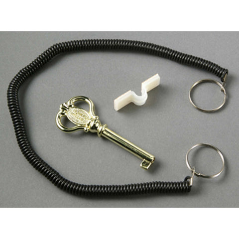 A vintage key on a coiled lanyard with two key rings and a white connector piece.