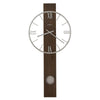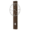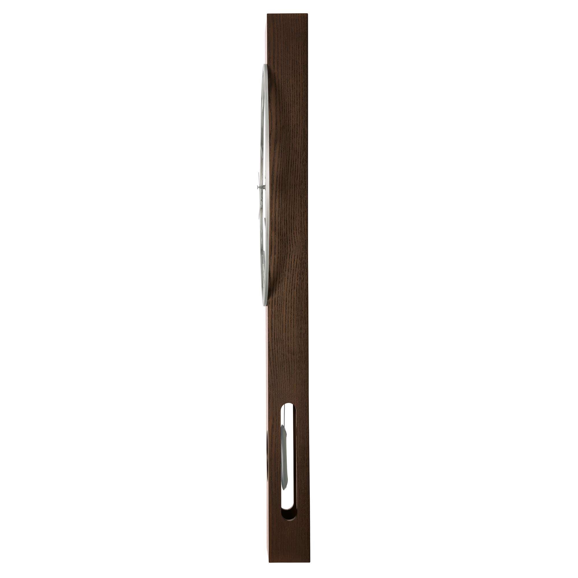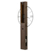 The clock features a translucent satin espresso finished wood column with a metal dial in aged silver. The oversized pendulum bob swings through cutouts on both sides of the column.