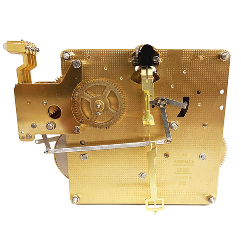 The Hermle 351-030A is a German-made 8-day spring-driven Westminster chime movement featuring a 43 cm pendulum, 33.2mm hand shaft, and 5 bottom-mounted hammers for traditional quarter-hour and hour strike performance.