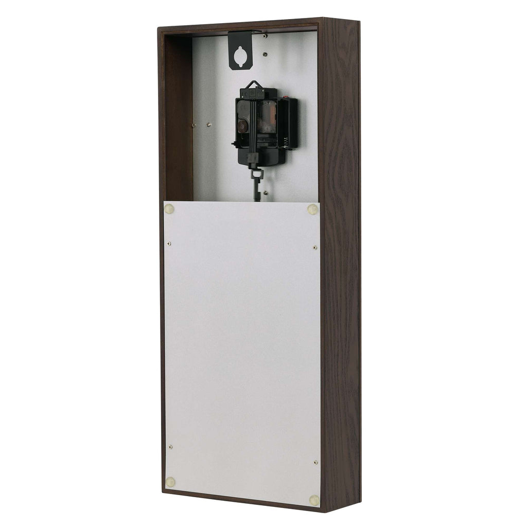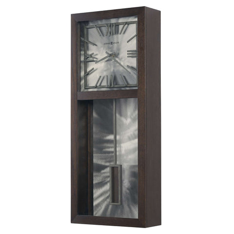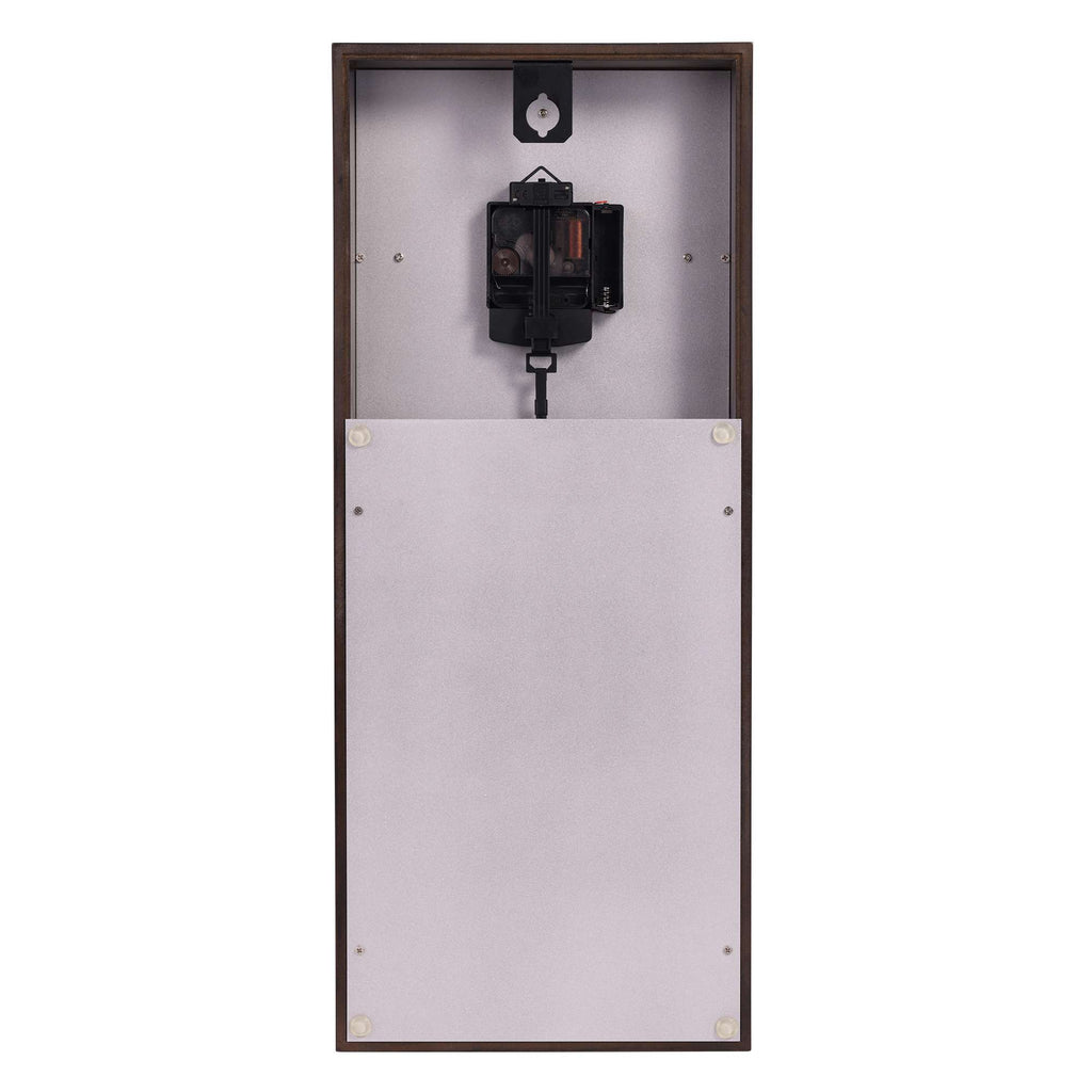 Clock Design: This rectangular wall clock features a translucent satin espresso stained finish on select veneers with a machined steel back panel. The rectangular pendulum is comprised of satin espresso finished wood with an aged charcoal gray finished metal frame and stick, completely enclosed and protected by a flat glass.