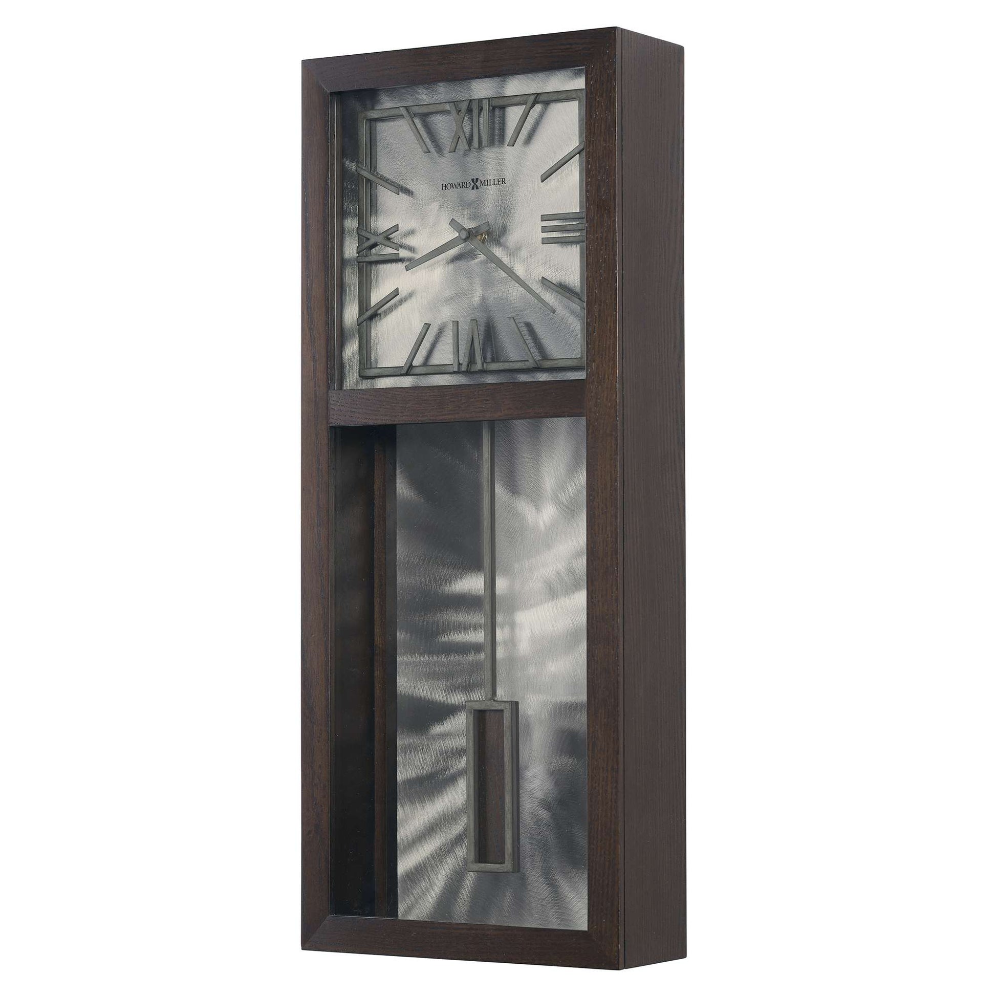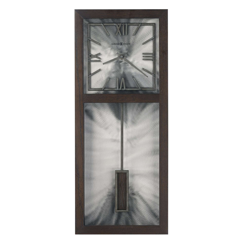 Accentuate your décor with this transitional wall clock featuring a rectangular body, brushed metal texture, and aged charcoal metalwork for the dial and pendulum.