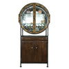 - This porthole bar cabinet features two distinctive, hinged doors with faux rivets, elongated hinges, strap pulls finished in aged brass, and open up to 180°.