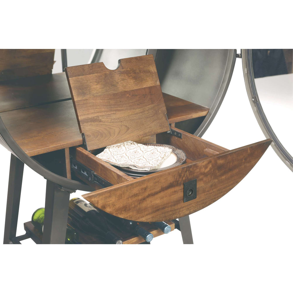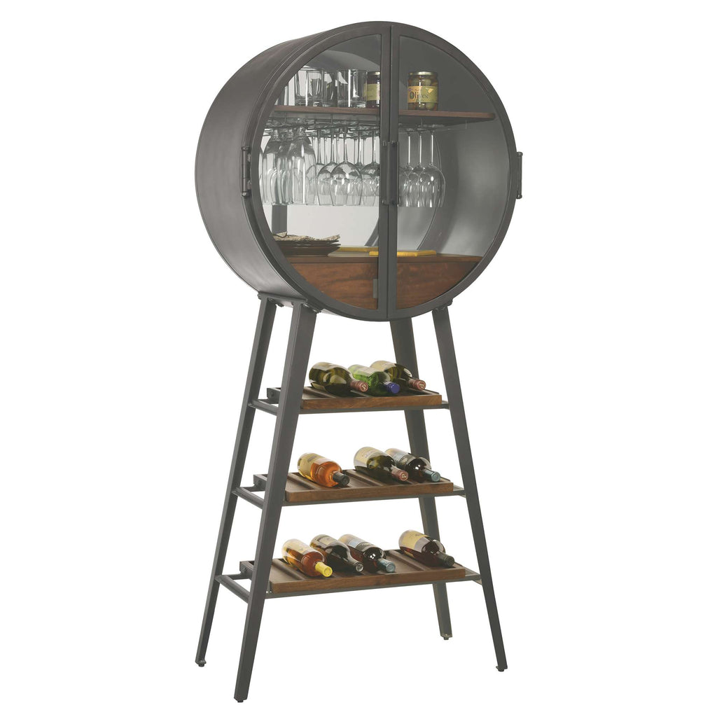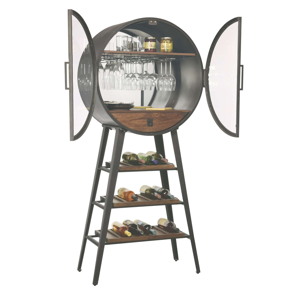 The cabinet includes three lower reversible wooden shelves that can hold 15 wine bottles, along with a pull-out drawer for additional storage.