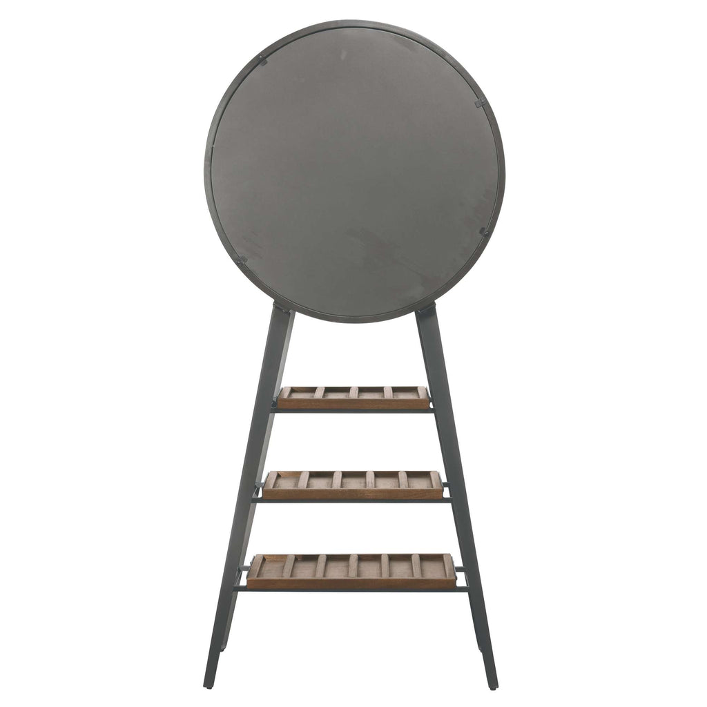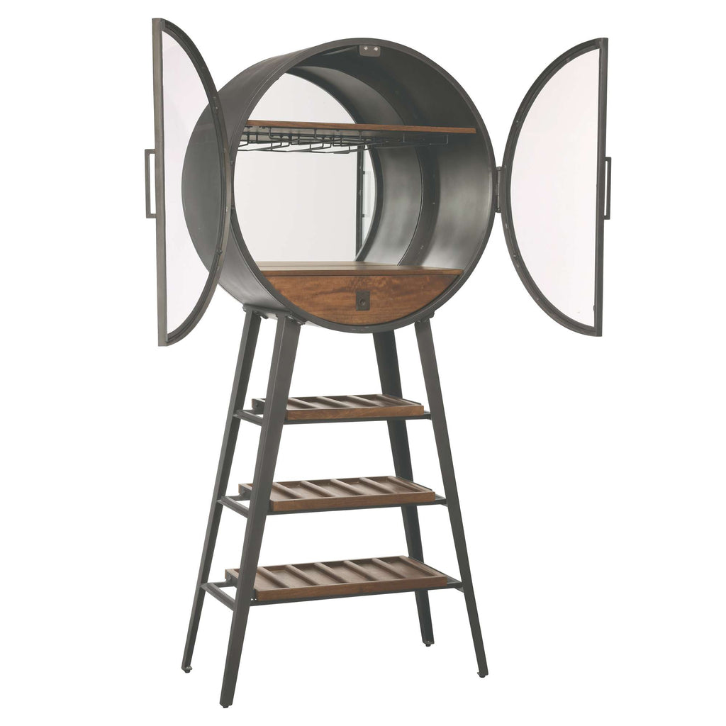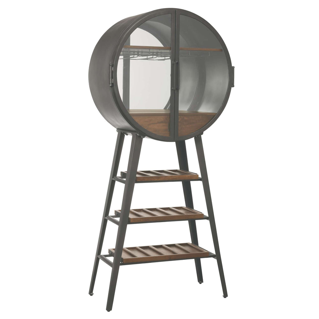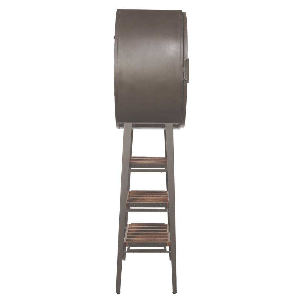 The cabinet features a stunning blend of industrial charm and vintage-inspired elegance, finished in aged iron with dark brown wood components.