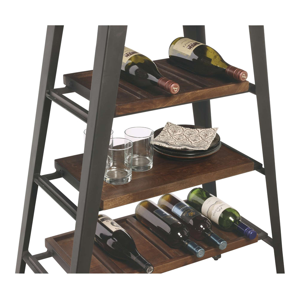 It can hold up to 12 large wine glasses on the wooden upper shelf with a metal stemware rack.